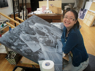 Today I went to the outskirts of the city to interview the painter Shi Zhiying, my third conversation with this artist who uses monochrome oil paint thinned down with turps and medium to create timeless images which reference her Buddhist beliefs.The turps smell which filled her studio was a welcome respite from the metallic toxic tang of the air outside. More on this interview in a later post.